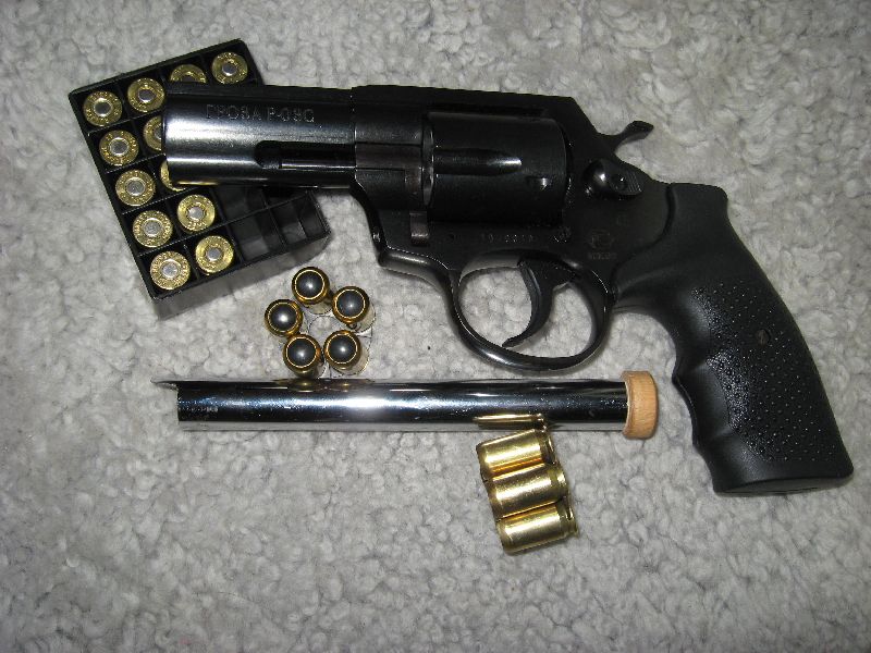 Револьвер стреляет патронами, сами понимаете, 45-го калибра, кои производят Техкрим и АКБС.